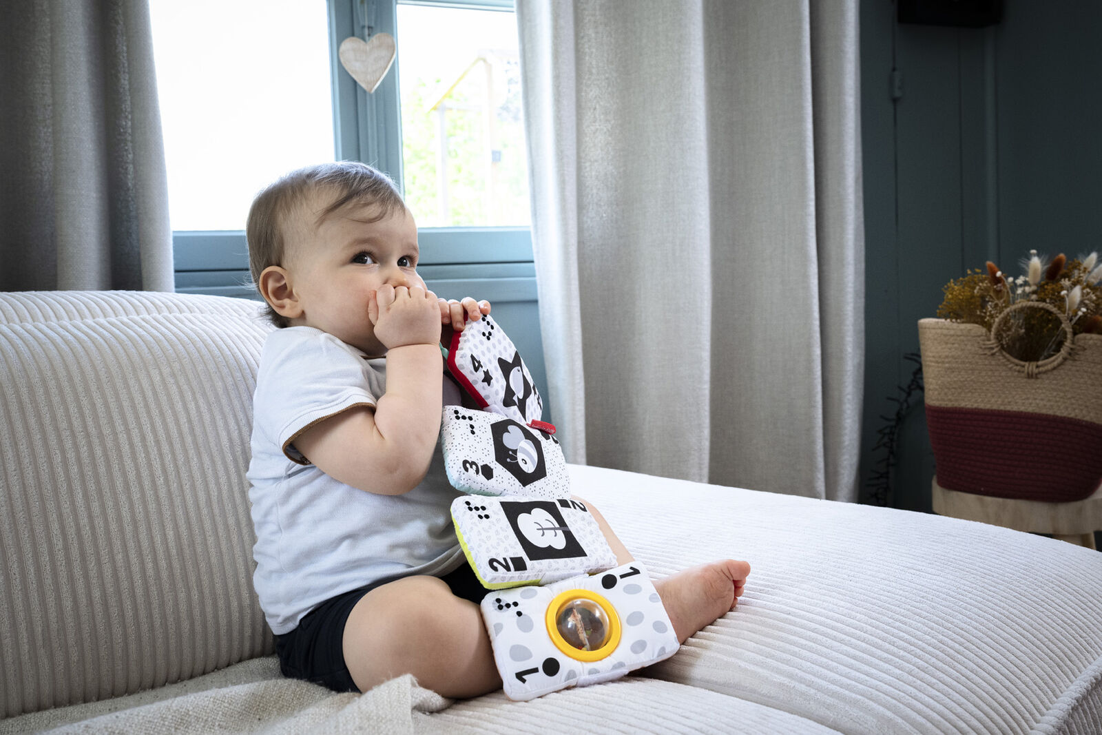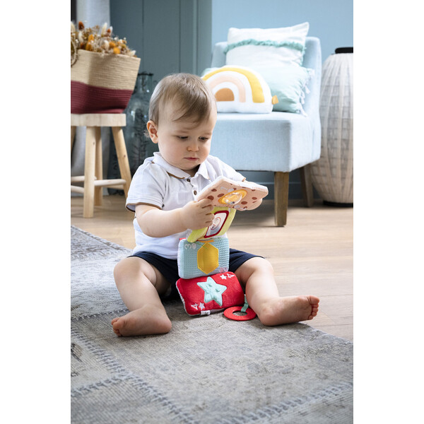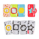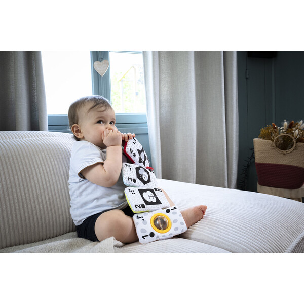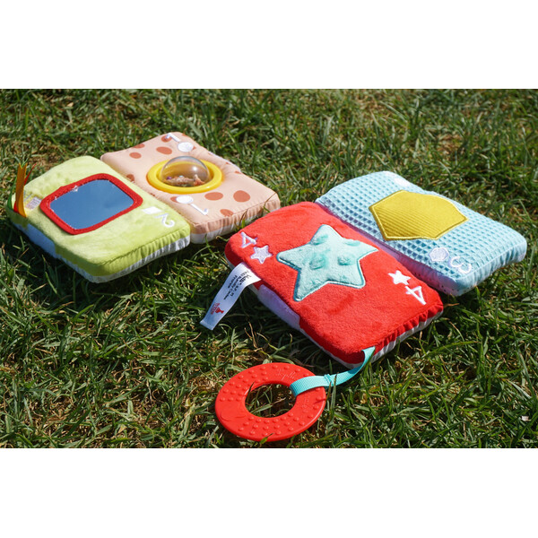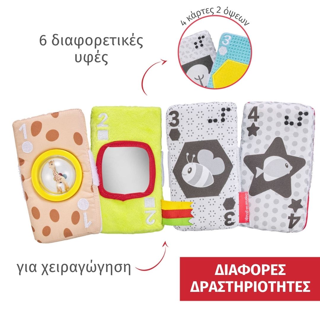 Υφασμάτινες κάρτες διαφόρων χρωμάτων, σχεδίων και υφών, που διεγείρουν όλες τις αισθήσεις του μωρού. Μπορούν να ενωθούν με Velcro® και να σχηματίσουν μια εικόνα, ενσωματώνοντας ακόμη και γραφή Braille.