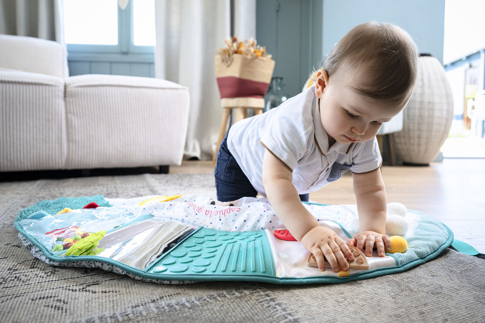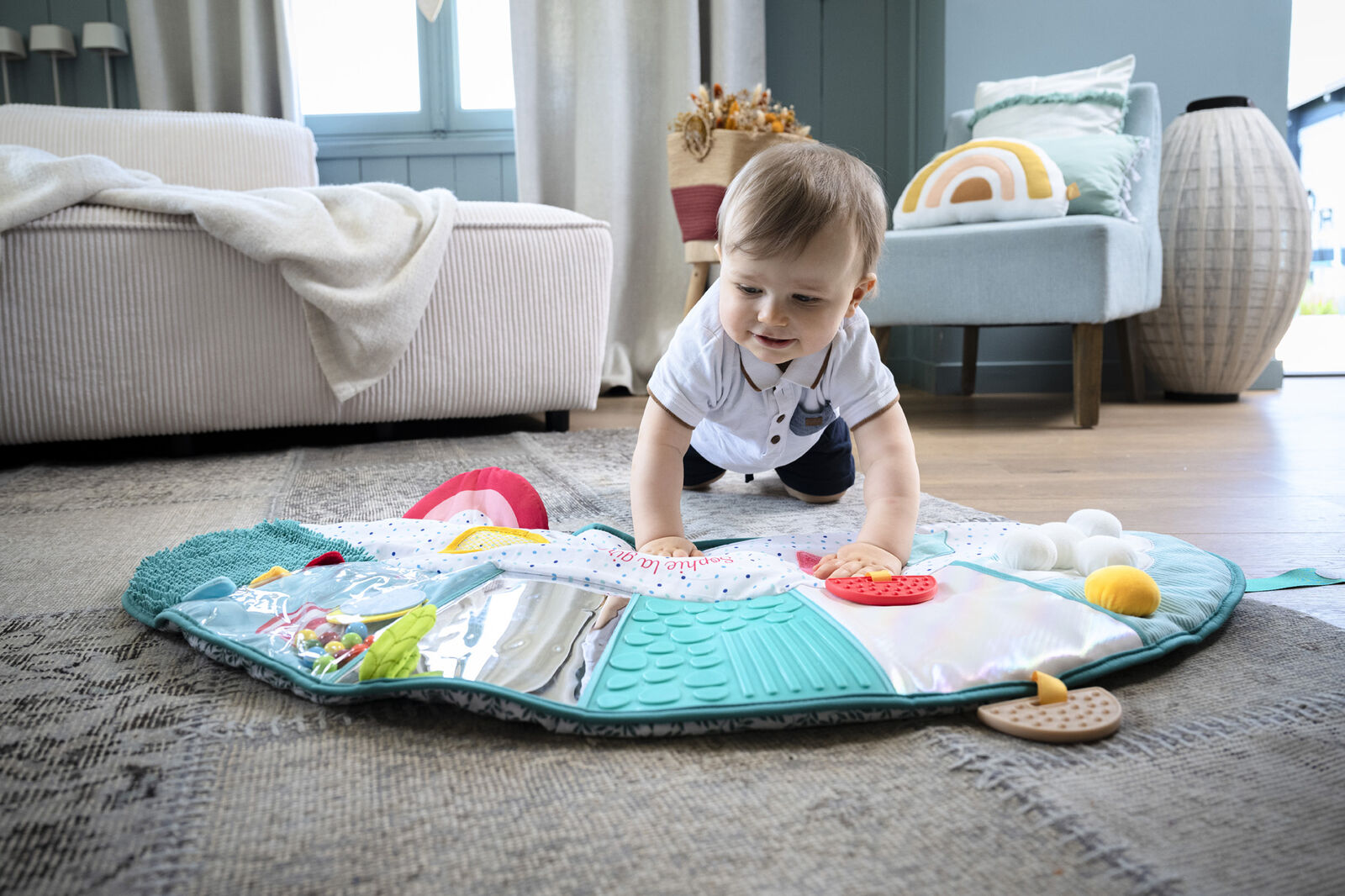 Το χαλάκι γιόγκα της Sophie προσφέρει ένα ασφαλές και διασκεδαστικό περιβάλλον όπου το μωρό: