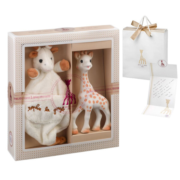 Αυτό το πανέμορφο σετ δώρου περιλαμβάνει την αγαπημένη μας Σόφι φτιαγμένη από 100% φυσικό καουτσούκ και είναι ένα ασφαλές και φυσικό παιχνίδι οδοντοφυΐας για το μικρό σας καθώς και ένα πανάκι παρηγοριάς, απαλό σε χρώμα και υφή έτοιμο να αγκαλιάσει και να παρηγορίσει το μωρό σας.