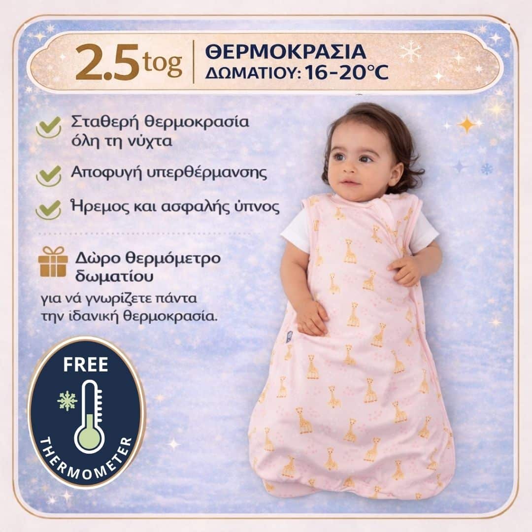 Για ακόμη μεγαλύτερη διευκόλυνση των γονιών, κάθε υπνόσακος BabyBliss συνοδεύεται ΔΩΡΕΑΝ από ένα καλαίσθητο θερμόμετρο δωματίου, το οποίο παρέχει οδηγίες στην πίσω πλευρά του για το πώς να ντύσετε το παιδί σας.