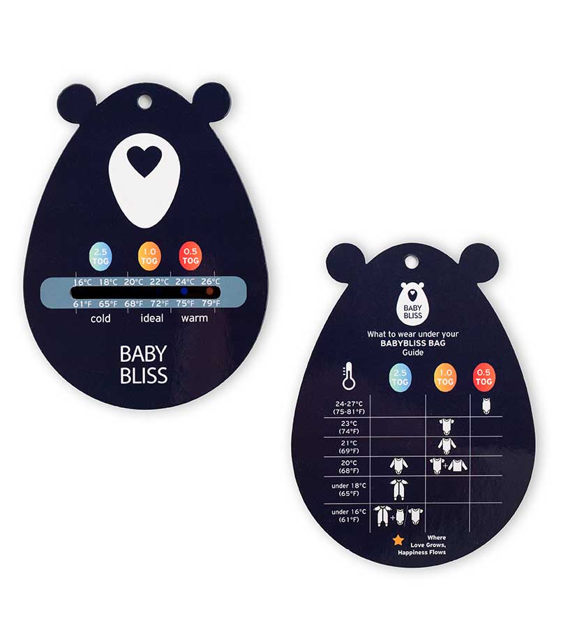 Για ακόμη μεγαλύτερη διευκόλυνση των γονιών, κάθε υπνόσακος BabyBliss συνοδεύεται ΔΩΡΕΑΝ από ένα καλαίσθητο θερμόμετρο δωματίου, το οποίο παρέχει οδηγίες στην πίσω πλευρά του για το πώς να ντύσετε το παιδί σας.