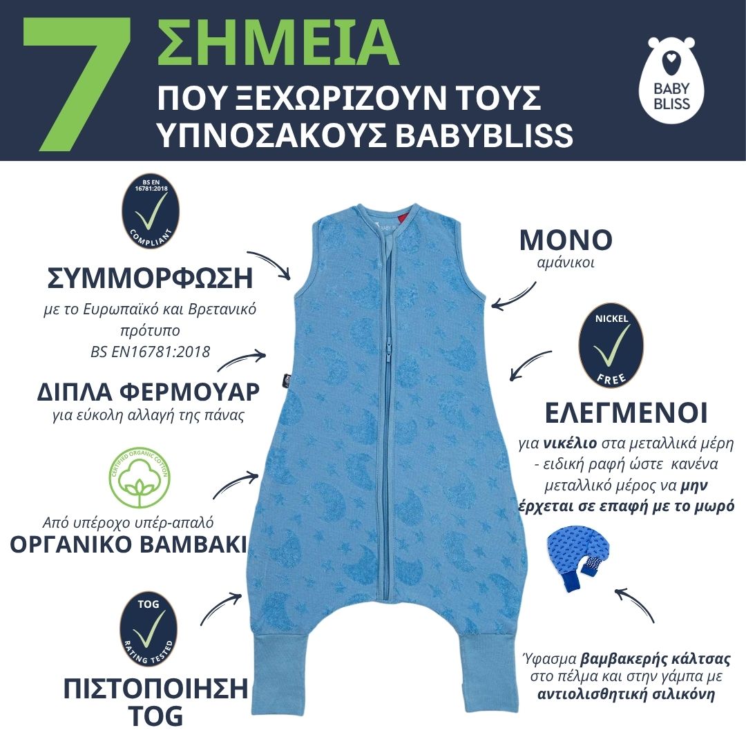 Οι υπνόσακοι BabyBliss κατασκευάζονται ακολουθώντας αυστηρά πρότυπα ασφάλειας και κανονισμούς. Όλοι οι υπνόσακοι της BabyBliss