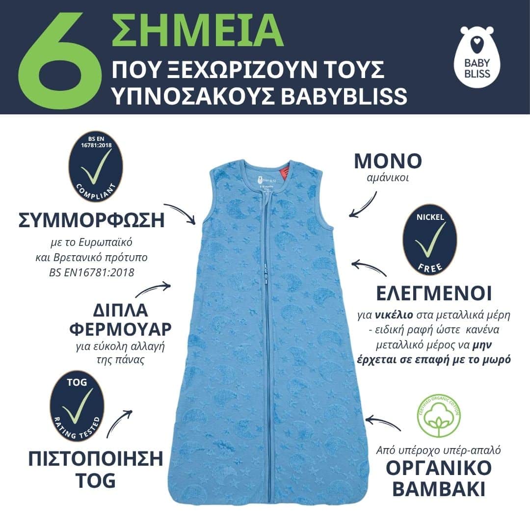 Οι υπνόσακοι BabyBliss κατασκευάζονται ακολουθώντας αυστηρά πρότυπα ασφάλειας και κανονισμούς. Όλοι οι υπνόσακοι της BabyBliss