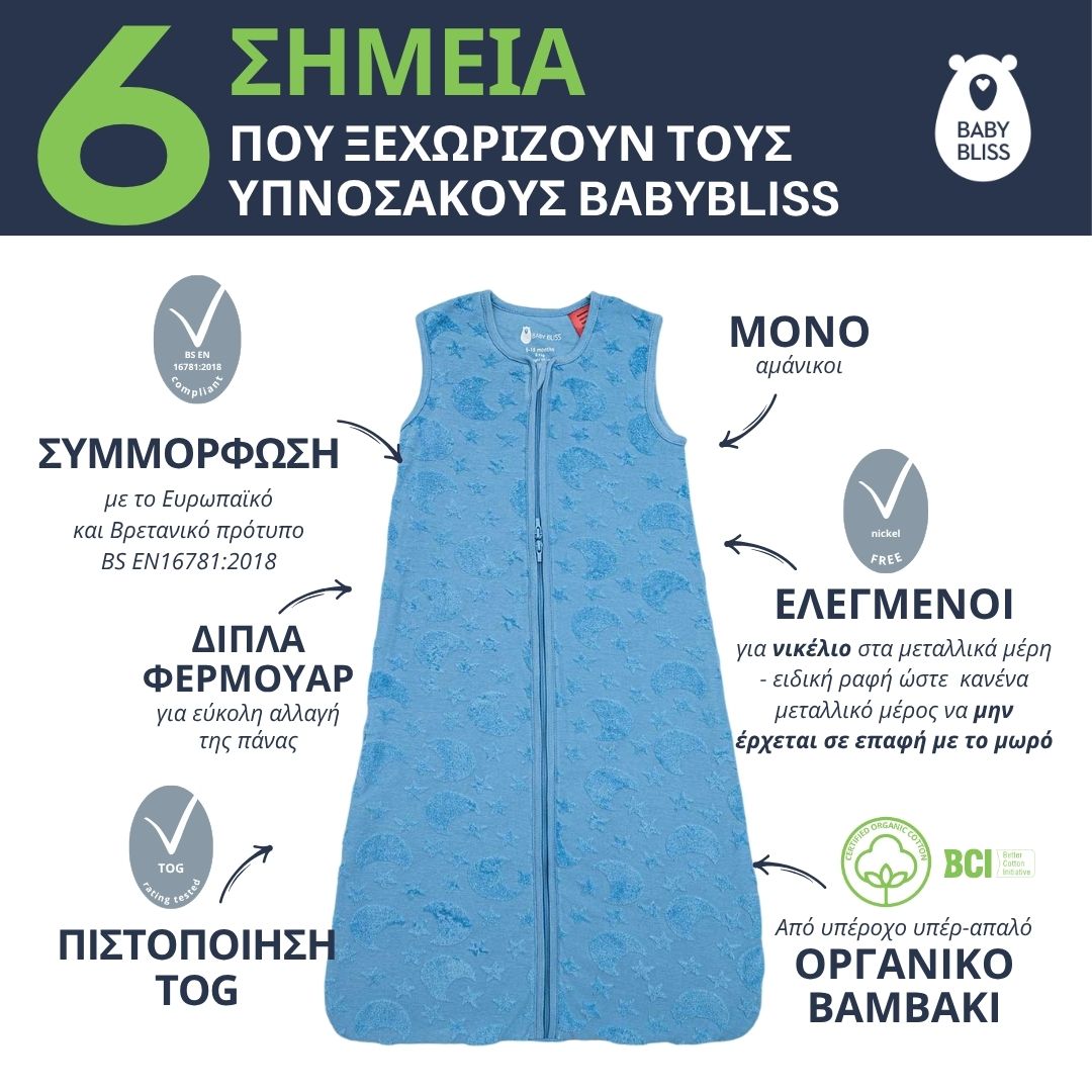 Οι υπνόσακοι BabyBliss κατασκευάζονται ακολουθώντας αυστηρά πρότυπα ασφάλειας και κανονισμούς. Όλοι οι υπνόσακοι της BabyBliss