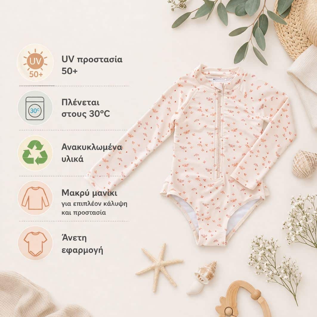Η UV προστασία 50+ φροντίζει το ευαίσθητο δερματάκι της, ώστε να απολαμβάνει τον ήλιο με ασφάλεια