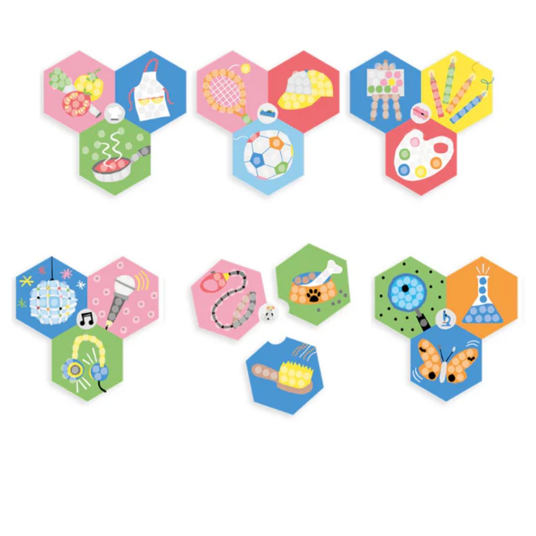 Βρέξτε λίγο τα σφουγγαράκια με νερό και τοποθετήστε τα πάνω στα πολύχρωμα πρότυπα. Τα παιδιά μπορούν να δημιουργήσουν, να συνδυάσουν και να ανακαλύψουν τα αγαπημένα τους χόμπι με ατελείωτη φαντασία!