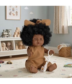 A: Η κούκλα είναι δημιουργημένη για να πλένεται εύκολα και να διατηρεί την ομορφιά της στο χρόνο, συμπεριλαμβανομένης της φυσικής υφής των μαλλιών της. Η περιγραφή εστιάζει στη διατήρηση της συνολικής ομορφιάς και ανθεκτικότητας.