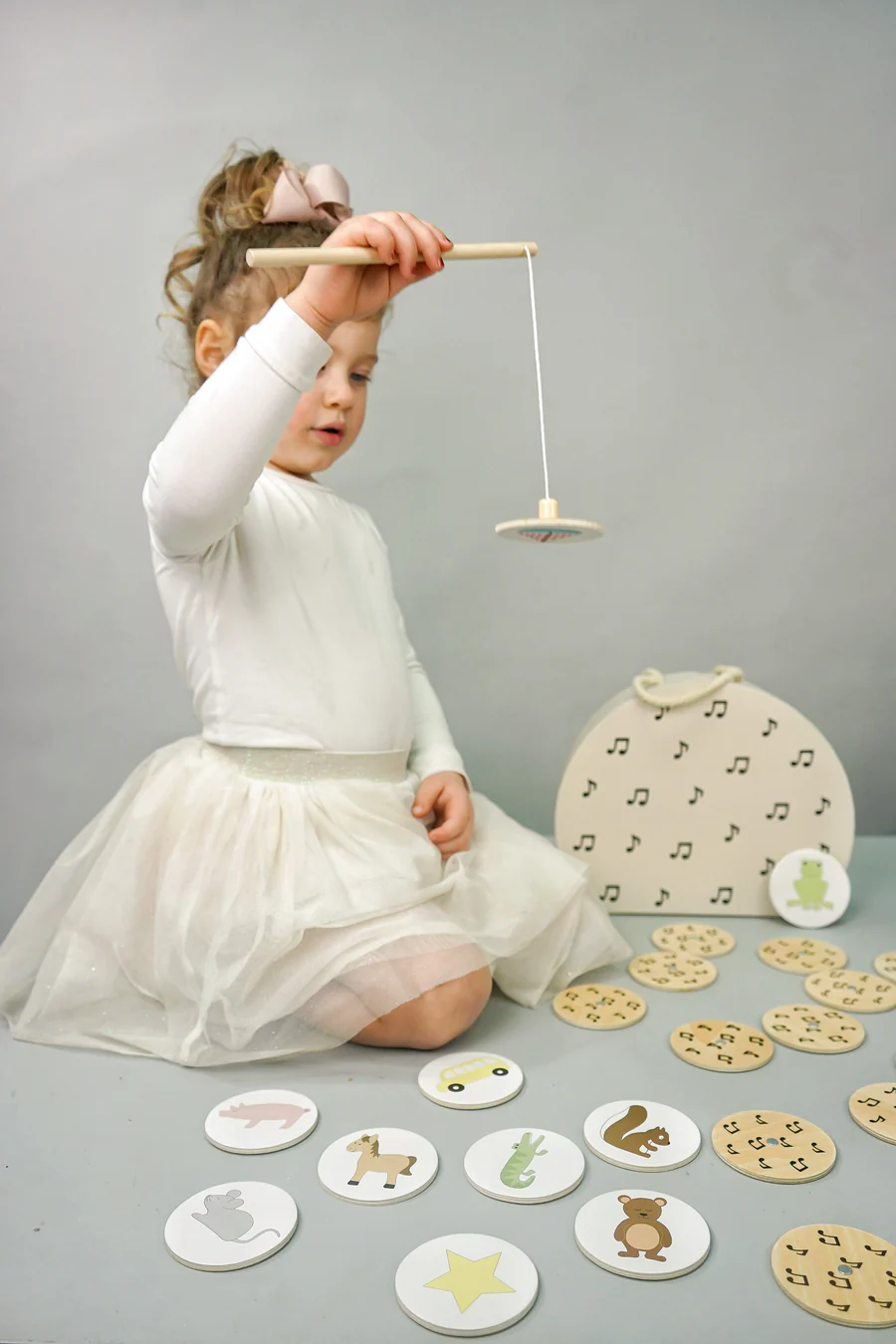 Μέσα στο βαλιτσάκι υπάρχουν 23 κάρτες με εικόνες από ζωάκια και έντομα που αντιστοιχούν σε διαφορετικά τραγούδια. Το παιδί χρησιμοποιεί το μικρό καλάμι για να «ψαρέψει» μια κάρτα και τραγουδάτε μαζί το τραγούδι που δείχνει η εικόνα.