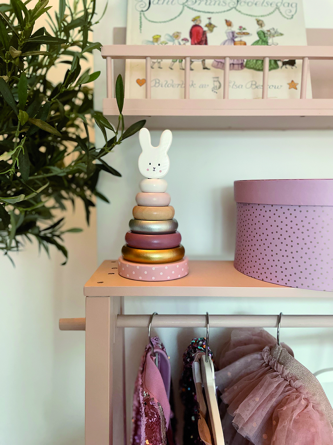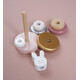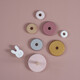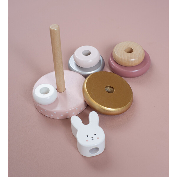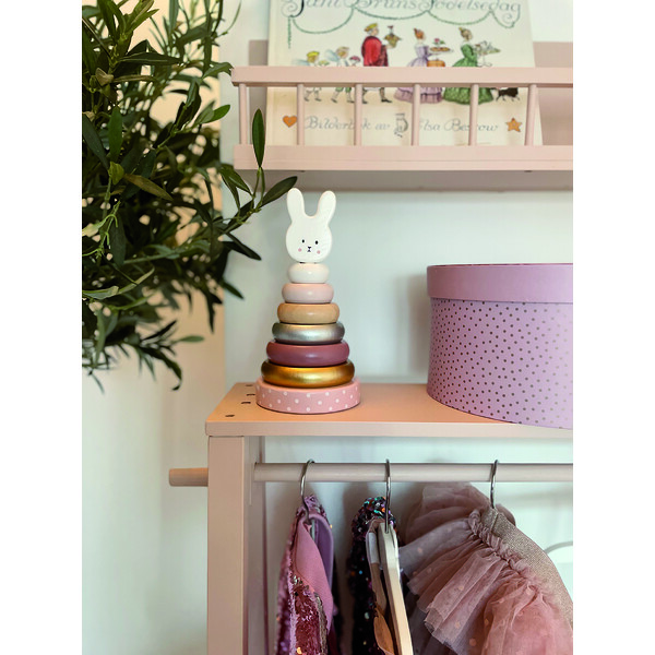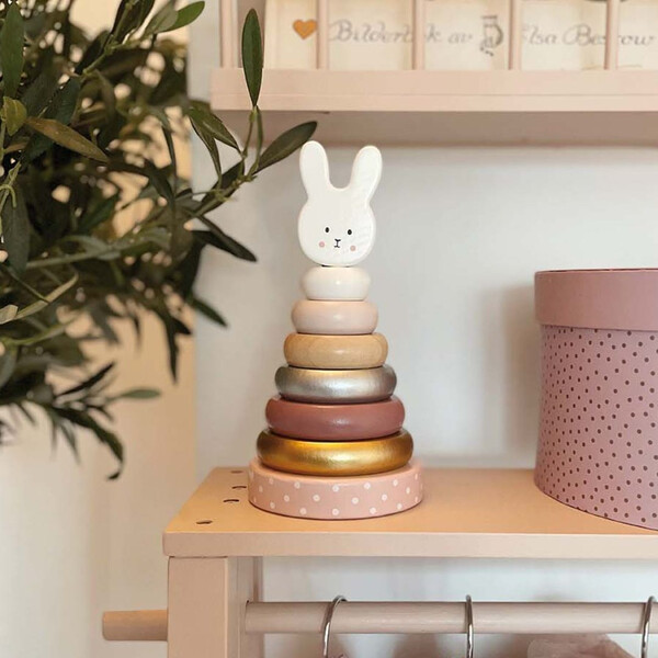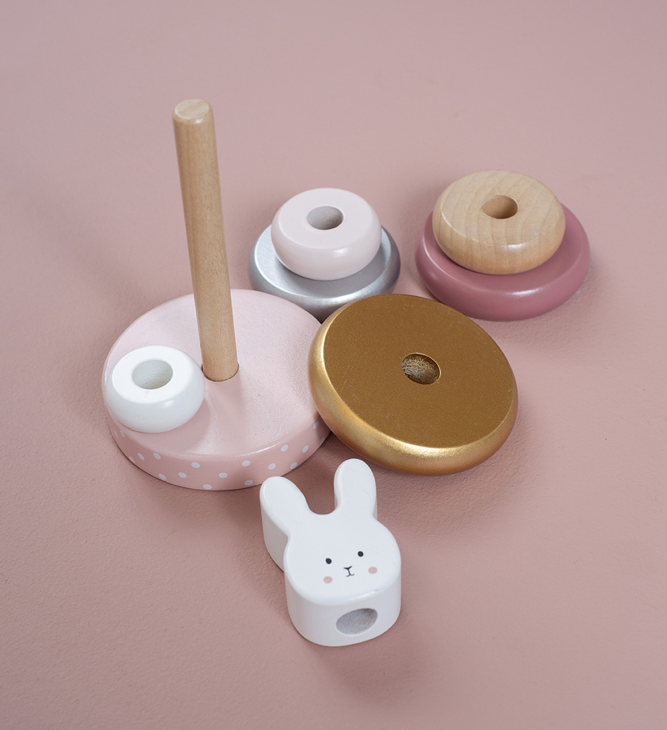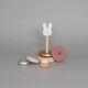Ξύλινα δαχτυλίδια τέλεια διαμορφωμένα για να μπορούν να τα κρατήσουν τα μικρά χεράκια. Εύκαμπτη ράβδος για μεγαλύτερη ασφάλεια και το κεφαλάκι του λαγουδιού στη κορυφή.