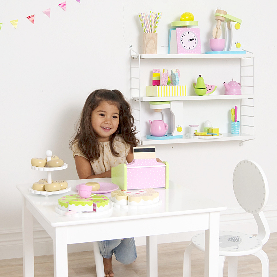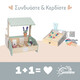 Ξύλινα προϊόντα και πάγκος με ράφια για να πουλάς, να συσκευάζεις και να μετράς προϊόντα, μαθαίνοντας αριθμούς και κοινωνικές δεξιότητες μέσα από παιχνίδι.