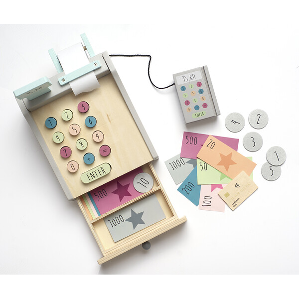 Ολοκληρωμένη ταμειακή μηχανή με συρταράκι για χρήματα, scanner, πιστωτική κάρτα και οθόνη αγορών. Περιλαμβάνει χαρτονομίσματα και κέρματα για ρεαλιστικό παιχνίδι ρόλων και εκμάθηση αξίας χρημάτων.
