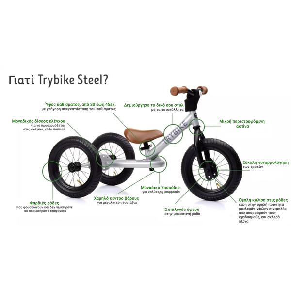 Απευθείας από την Ολλανδία, τη χώρα του ποδηλάτου, το Trybike είναι η ιδανική επιλογή για κάθε παιδί που θέλει να ανακαλύψει τη χαρά της ποδηλασίας με τον πιο φυσικό και ασφαλή τρόπο!