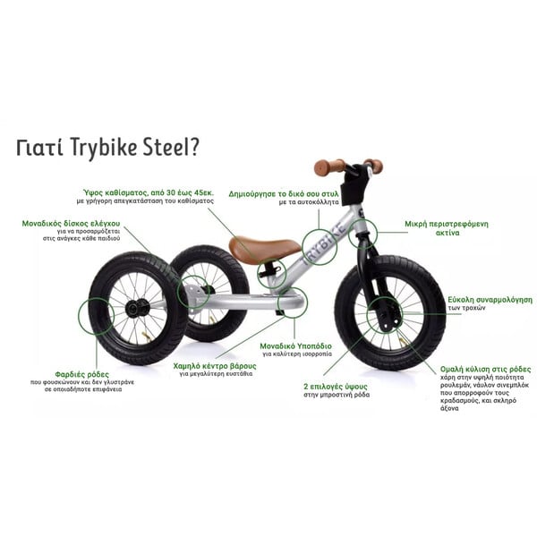 Τα ποδήλατα Trybike έχουν ένα μοναδικό υποπόδιο που πάει την ισορροπία...σε άλλο επίπεδο. Όταν το παιδί σας είναι ικανό να ισορροπεί κρατώντας τα πόδια του πάνω από το έδαφος για αρκετή ώρα είναι πιθανό να κάνει το επόμενο βήμα σε ένα ποδήλατο με πετάλια. Το μόνο πράγμα που θα έχει να μάθει μετά είναι το πετάλι και το φρένο. Μην βάζετε πλέον βοηθητικές ρόδες. Τα περισσότερα παιδιά θα μάθουν ποδήλατο με πετάλι μέσα σε 1 ή 2 ώρες όταν έχουν την εμπειρία ενός ποδηλάτου ισορροπίας Trybike