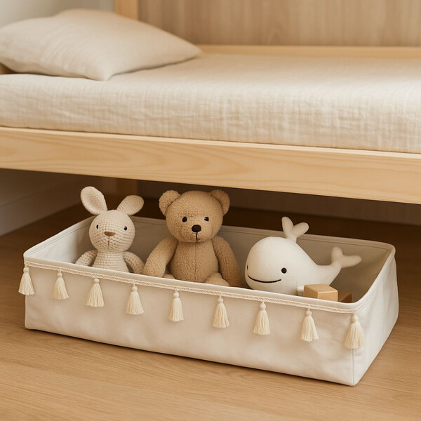 Εξαιρετικά πρακτικό, το καλάθι μπορεί να διπλωθεί και να αποθηκευτεί όταν δεν το χρειάζεστε, καταλαμβάνοντας ελάχιστο χώρο. Από τη μία πλευρά του, τα διακοσμημένα φουντίτσες προσθέτουν μια ιδιαίτερη πινελιά, κάνοντάς το όχι μόνο χρηστικό, αλλά και όμορφο όταν το τοποθετείτε κάτω από το κρεβάτι.