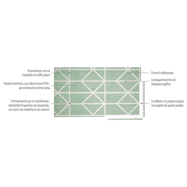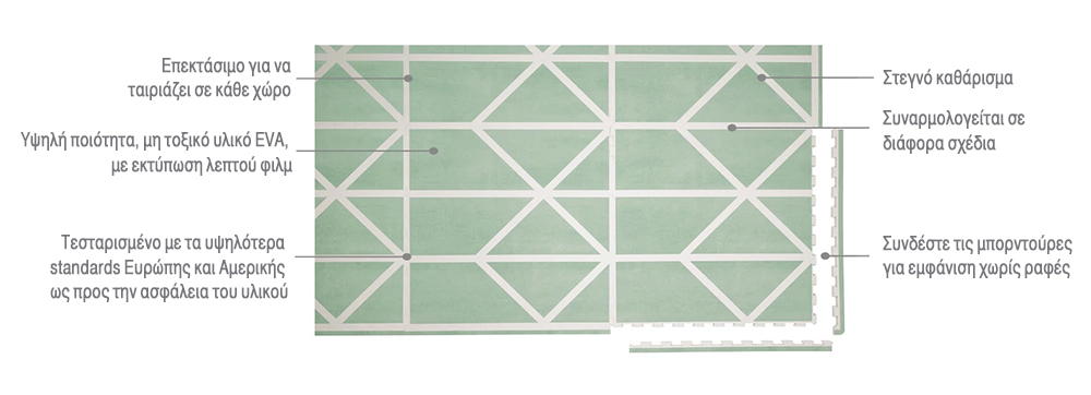 Θα μεταμορφώσει κάθε σημείο του σπιτιού σας σε ένα καλαίσθητο και καλόγουστο χώρο. Τα παιδιά θα είναι προστατευμένα από τις πτώσεις και εσείς χαρούμενη για την διακόσμησή σας. Ταιριάζουν σε όλους τους χώρους και μπορείτε να ενώσετε όσα κομμάτια θέλετε για να καλύψετε μεγαλύτερες επιφάνειες.