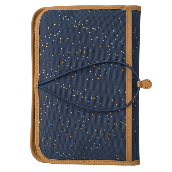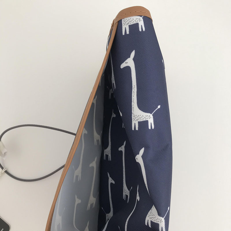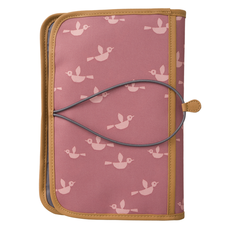 Διαθέτει εξωτερική θήκη και λάστικό για να κλείναι και να μην πέσει τίποτα. Ανοίγοντας το έχει το ματ αλλαγής πάνας, δυο μεγάλες θήκες και μία με φερμουάρ.