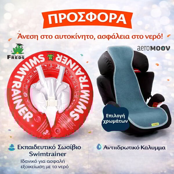 Με αυτό το σετ θα έχετε το τέλειο σωσίβιο Swimtrainer που θα μάθει στο μωρό σας να κολυμπάει και όχι απλά να επιπλέει και το αντι-ιδρωτικό κάλυμμα Air layer για να γίνονται οι μετακινήσεις σας με το καρότσι ή το κάθισμα του αυτοκινήτου . Δείτε αναλυτικά τα προΪοντα παρακάτω και καλά "δροσερά" μπανάκια!